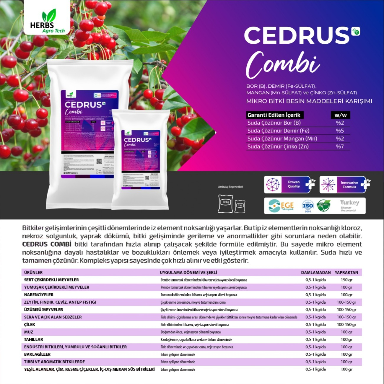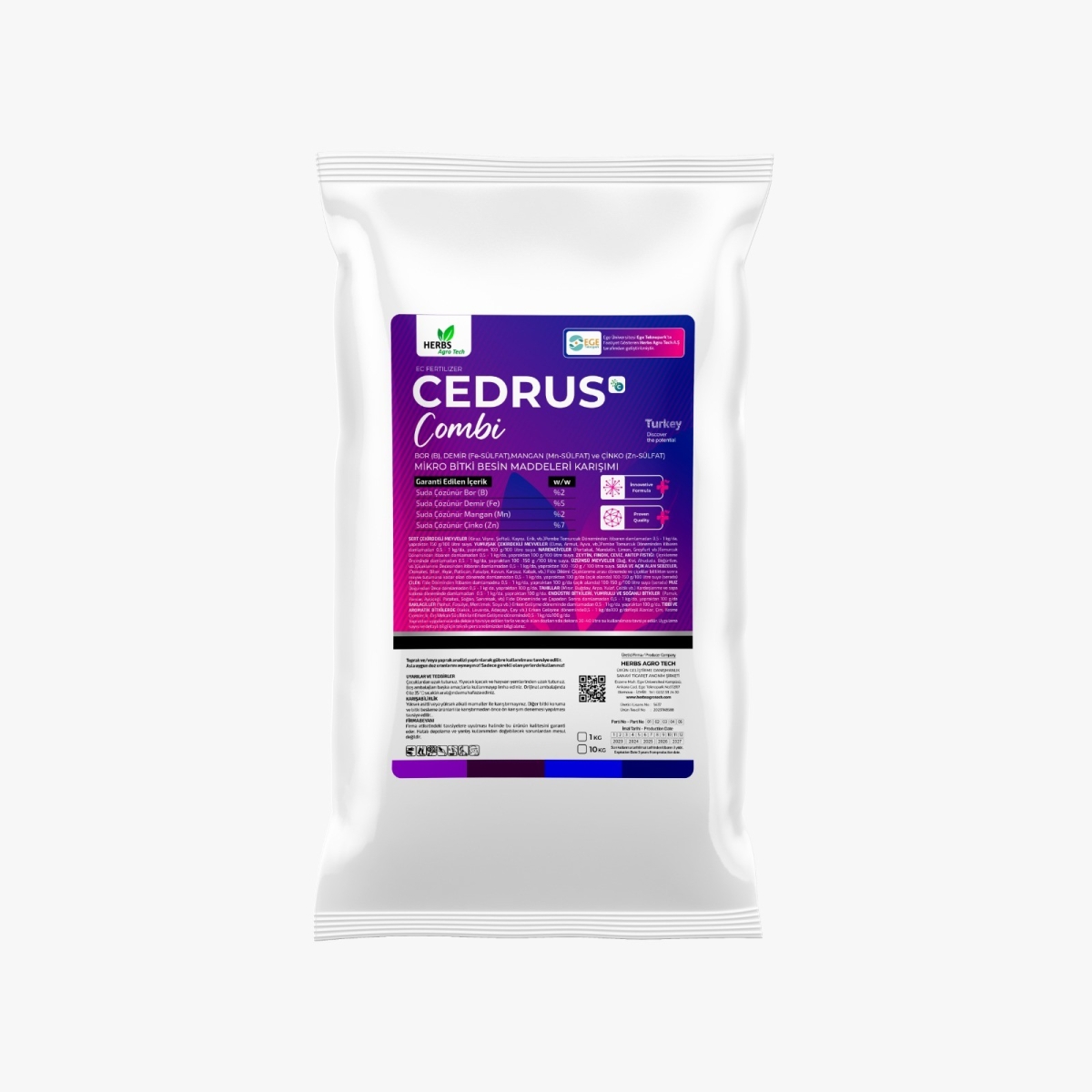 Bitkiler gelişimlerinin çeşitli dönemlerinde iz element noksanlığı yaşarlar. Bu tip iz elementlerin noksanlığı kloroz, nekroz solgunluk, yaprak dökümü, bitki gelişiminde gerileme ve anormallikler gibi sorunlara neden olabilir. CEDRUS COMBİ bitki tarafından hızla alınıp çalışacak şekilde formüle edilmiştir. Bu sayede mikro element noksanlığına dayalı hastalıklar ve bozuklukları önlemek veya iyileştirmek amacıyla kullanılır. Suda hızlı ve tamamen çözünür. Kompleks yapısı sayesinde çok hızlı alınır ve etki gösterir.